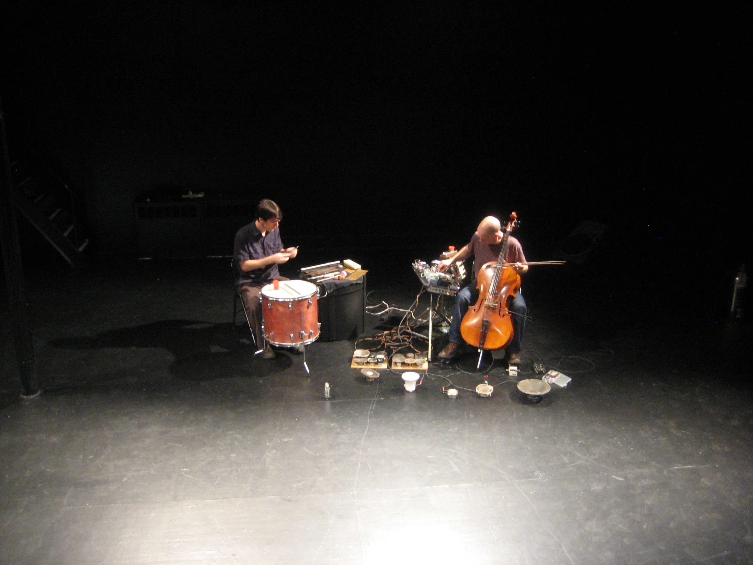 Tim Feeney and Vic Rawlings have performed as a duo since 2005. Their music explores an unpredictable relationship with making sounds, achieved by elaborate preparation of acoustic soundboxes, such as drums or cello, and expanded via original electronic instruments, ranging from naked circuitboards to amplified kitchen objects. They focus on the metamusical potential of unstable sounds and silences, exploring austere combinations of sound and the otherworldly ripple effects that pulse through a silent space or alert ears.