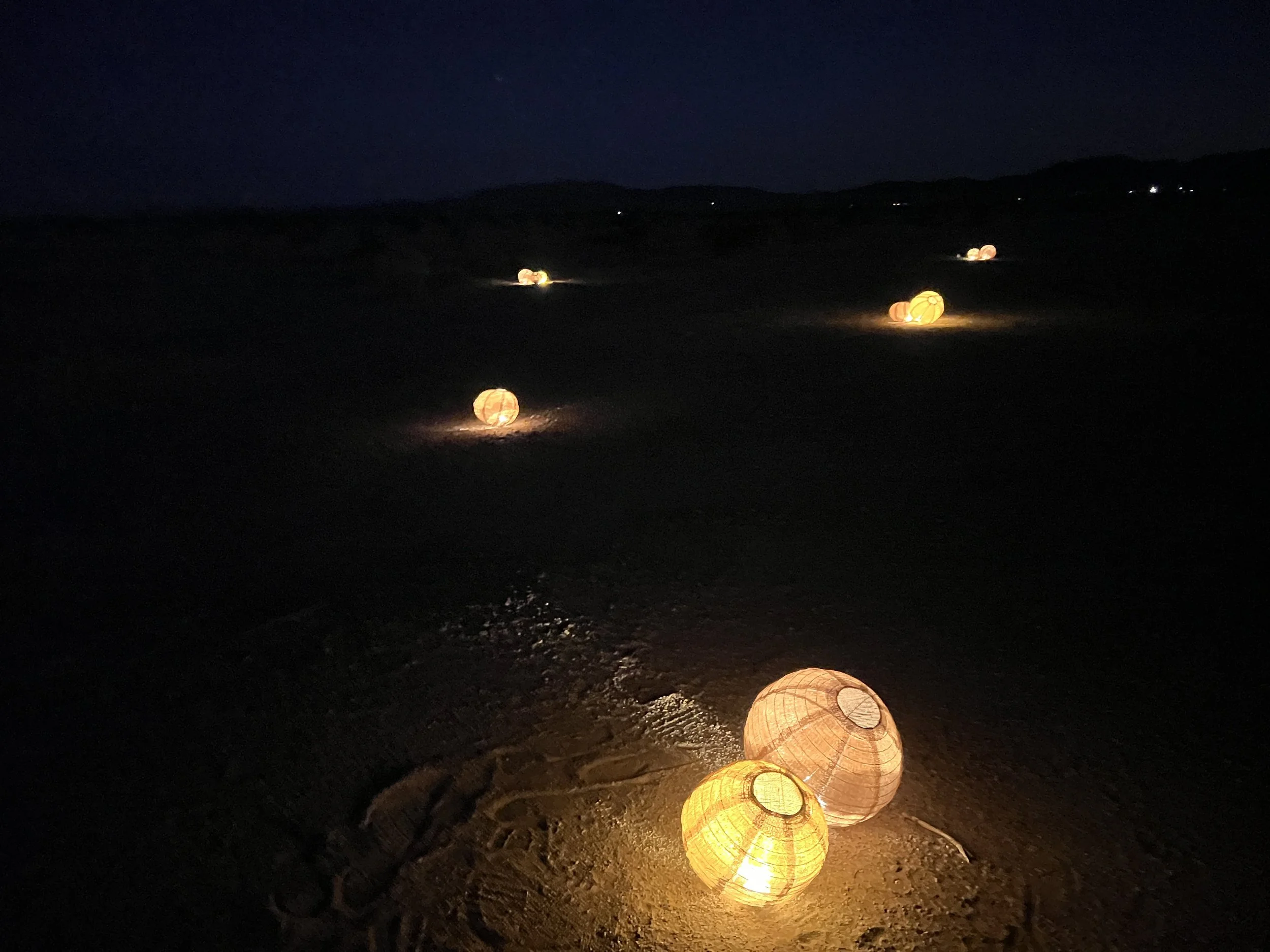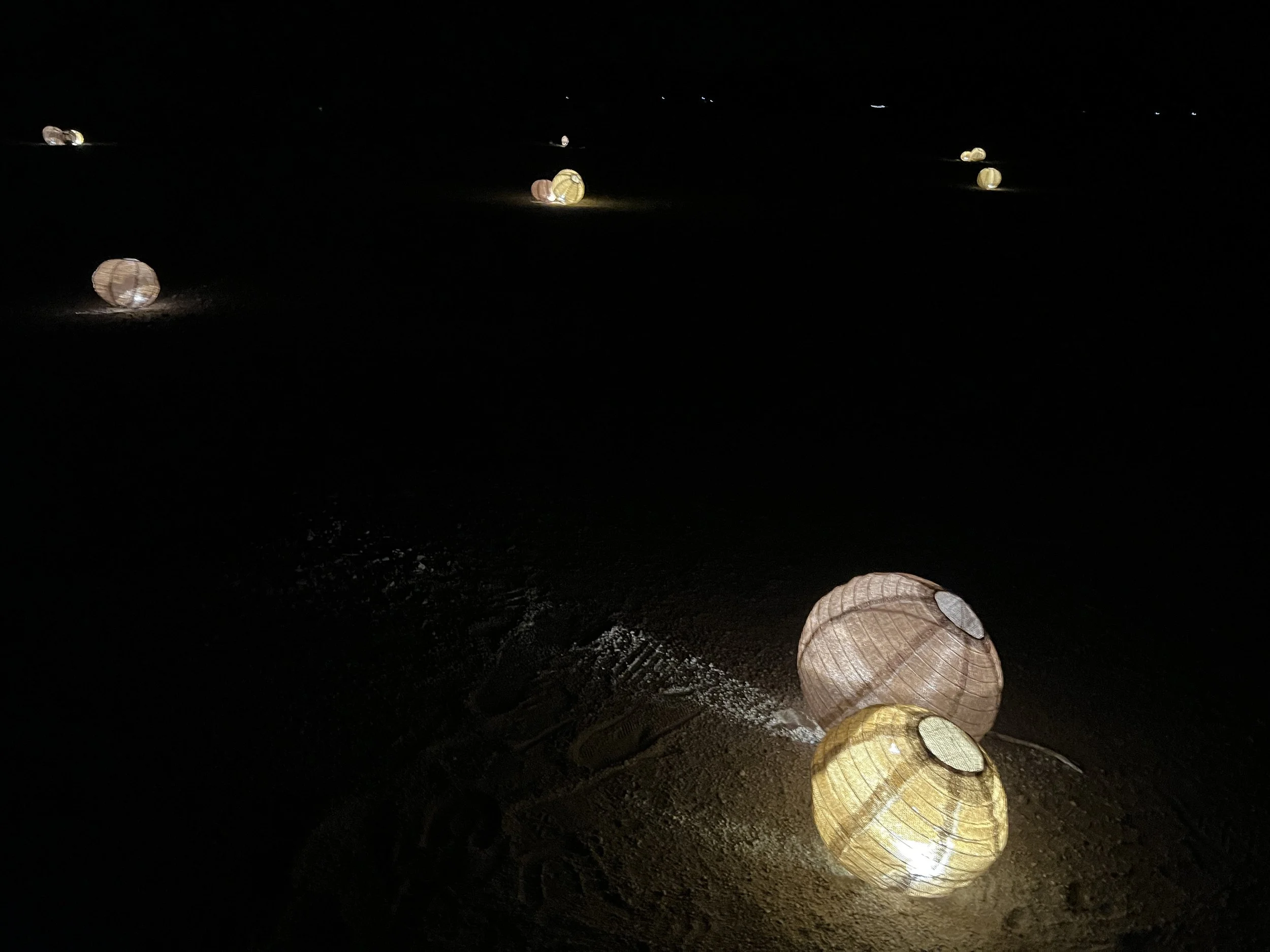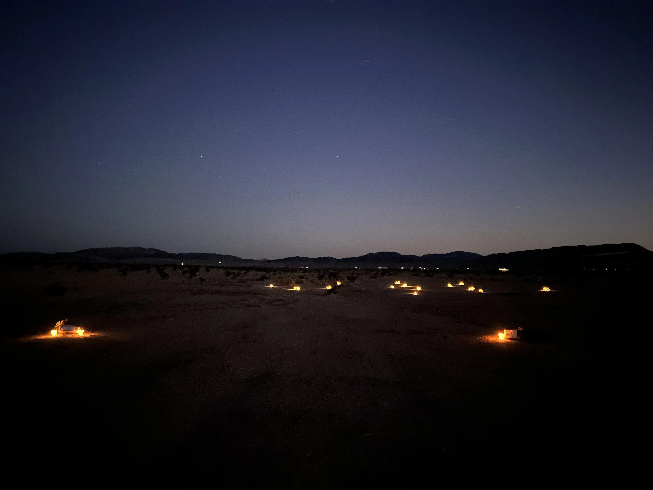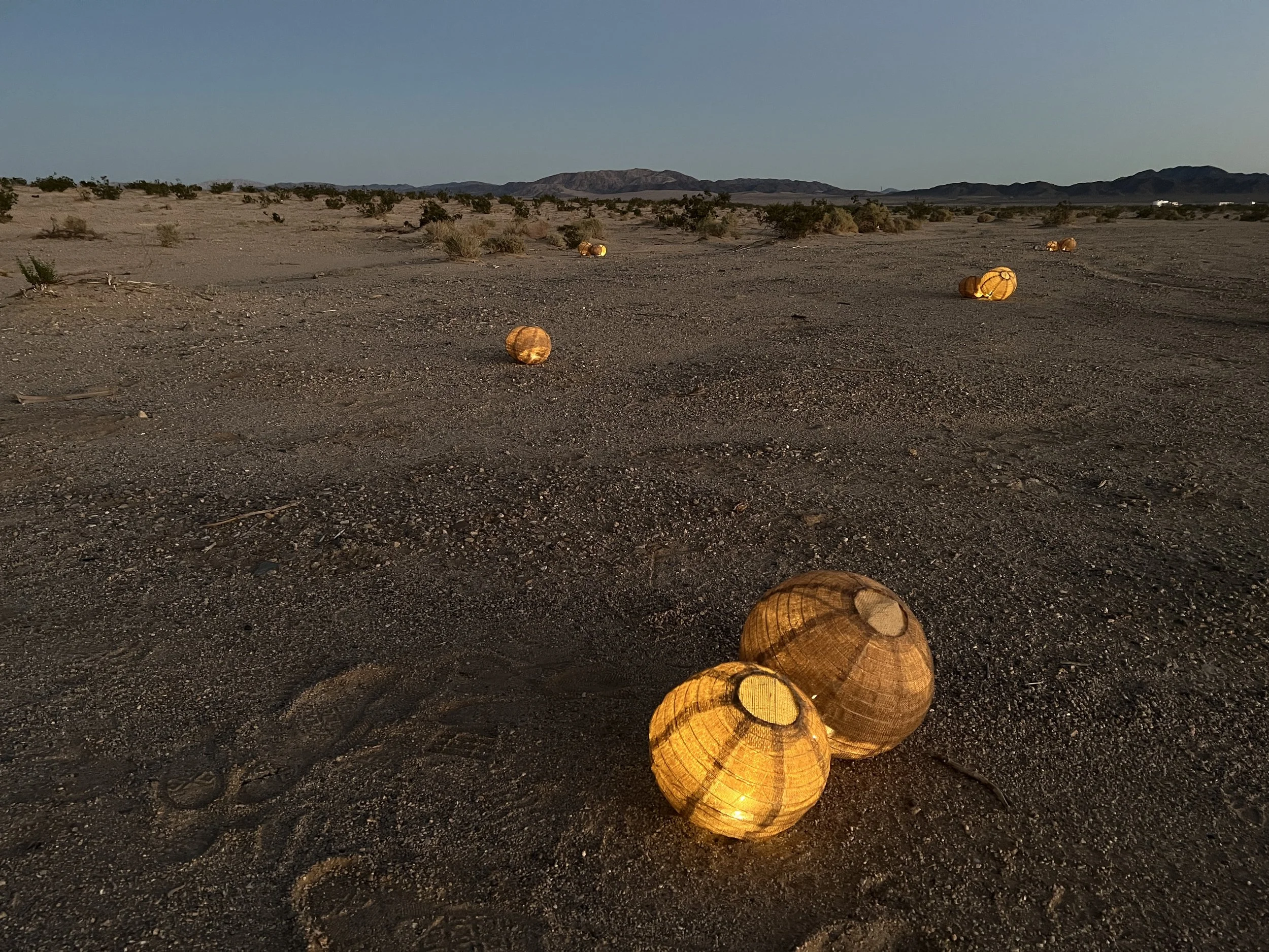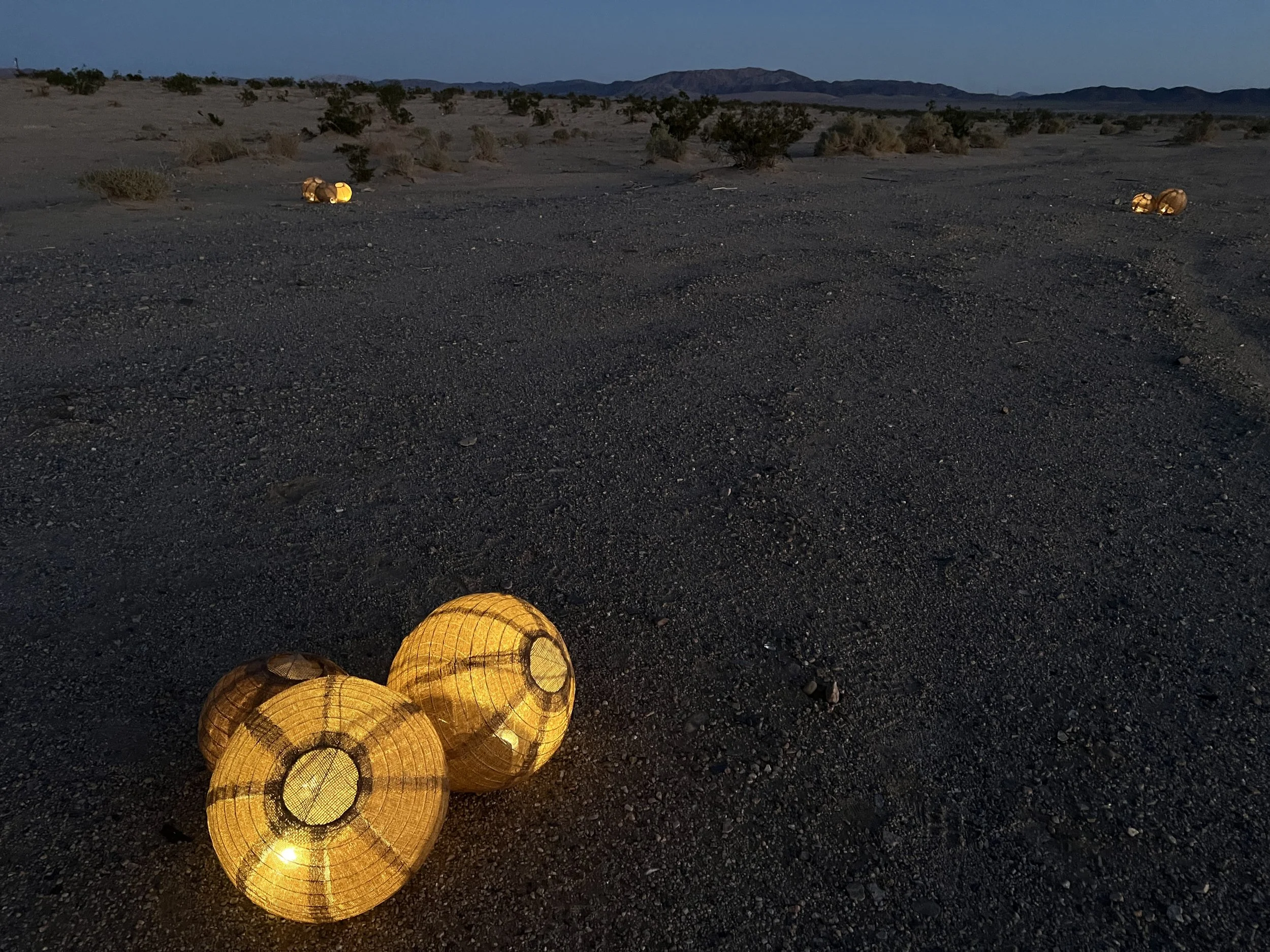 Twenty-seven sounding objects assembled from wireless speakers, LEDs, and burlap lanterns, strewn over an area of scrub, dust, and gravel.