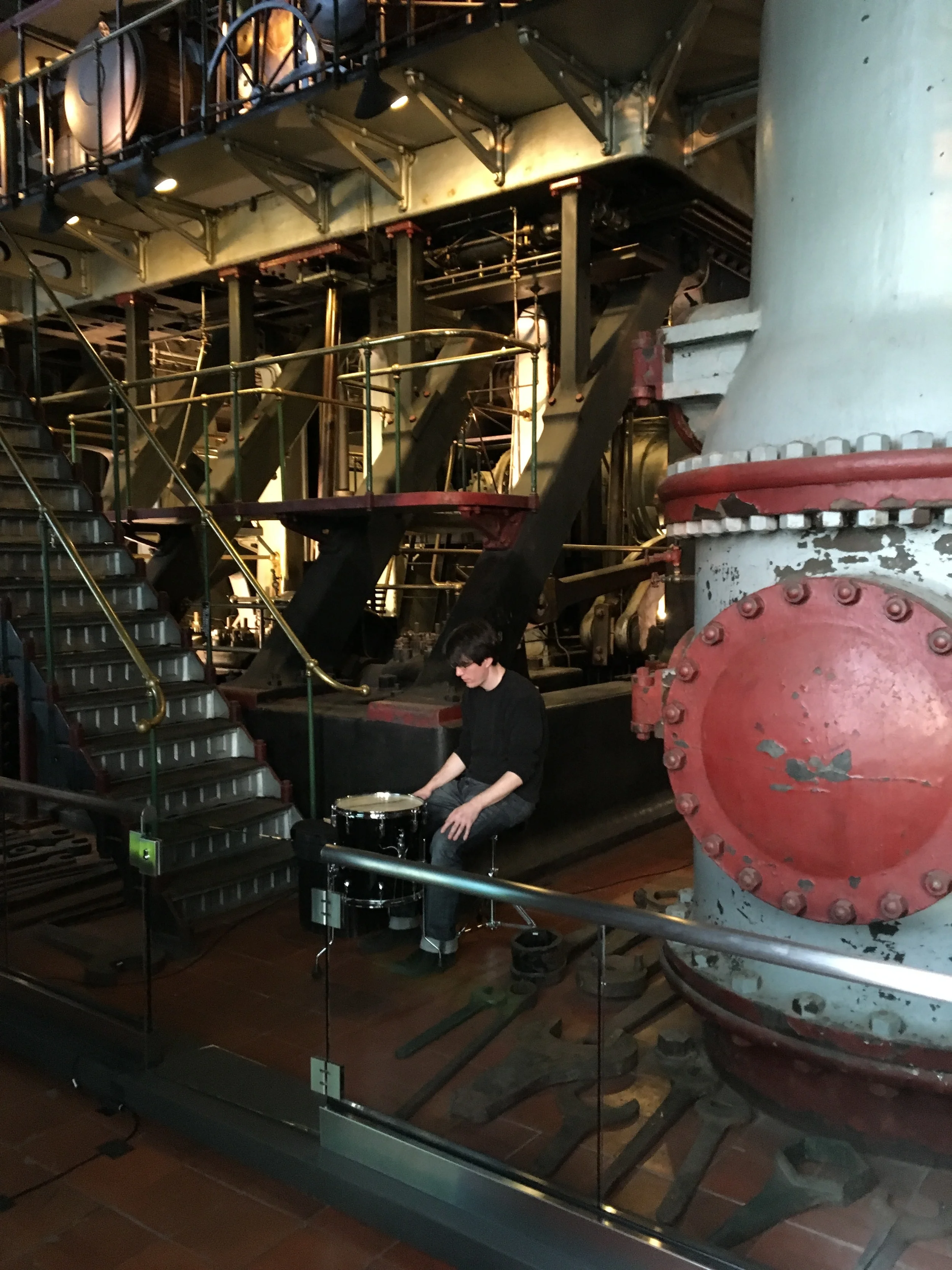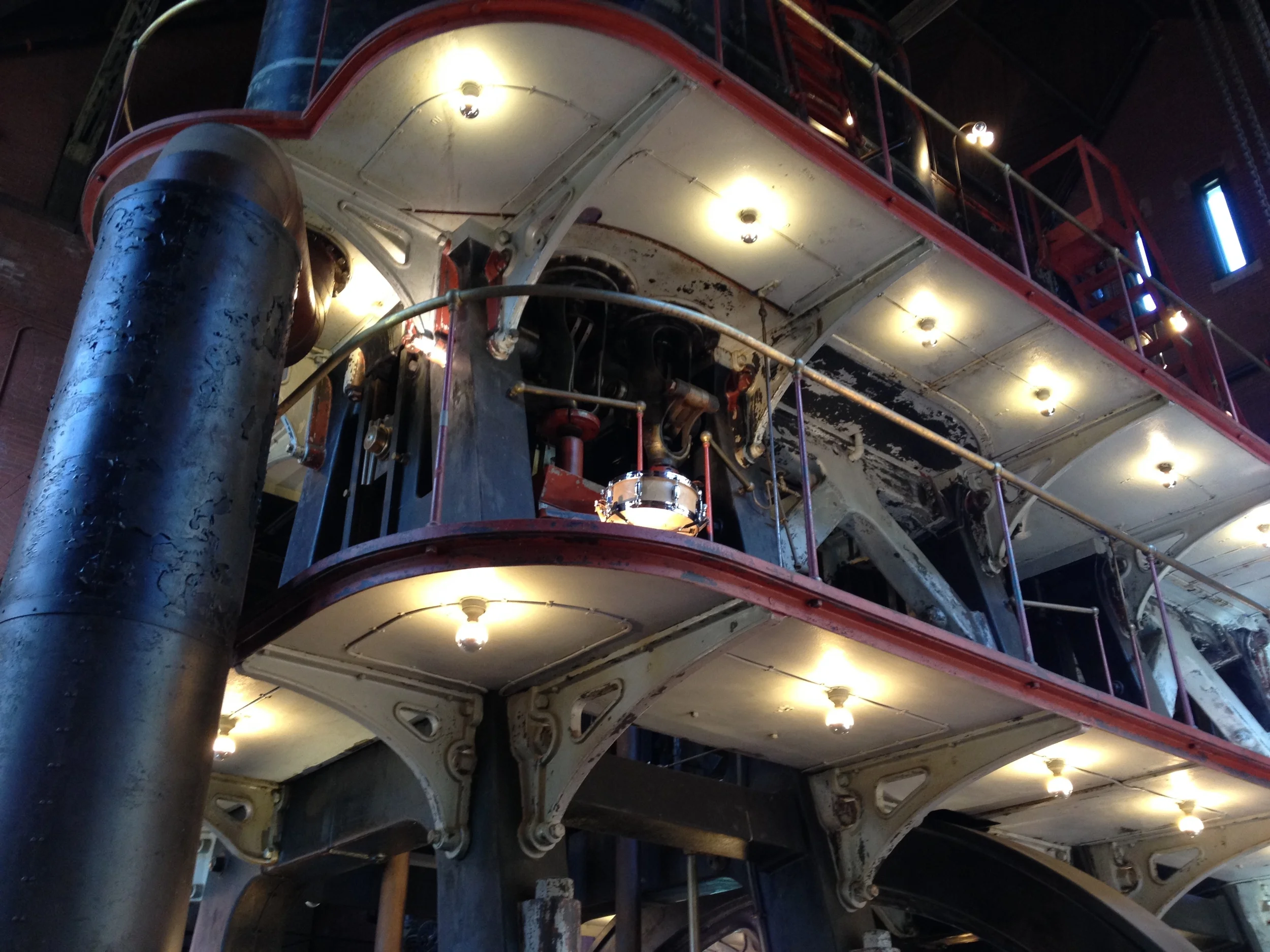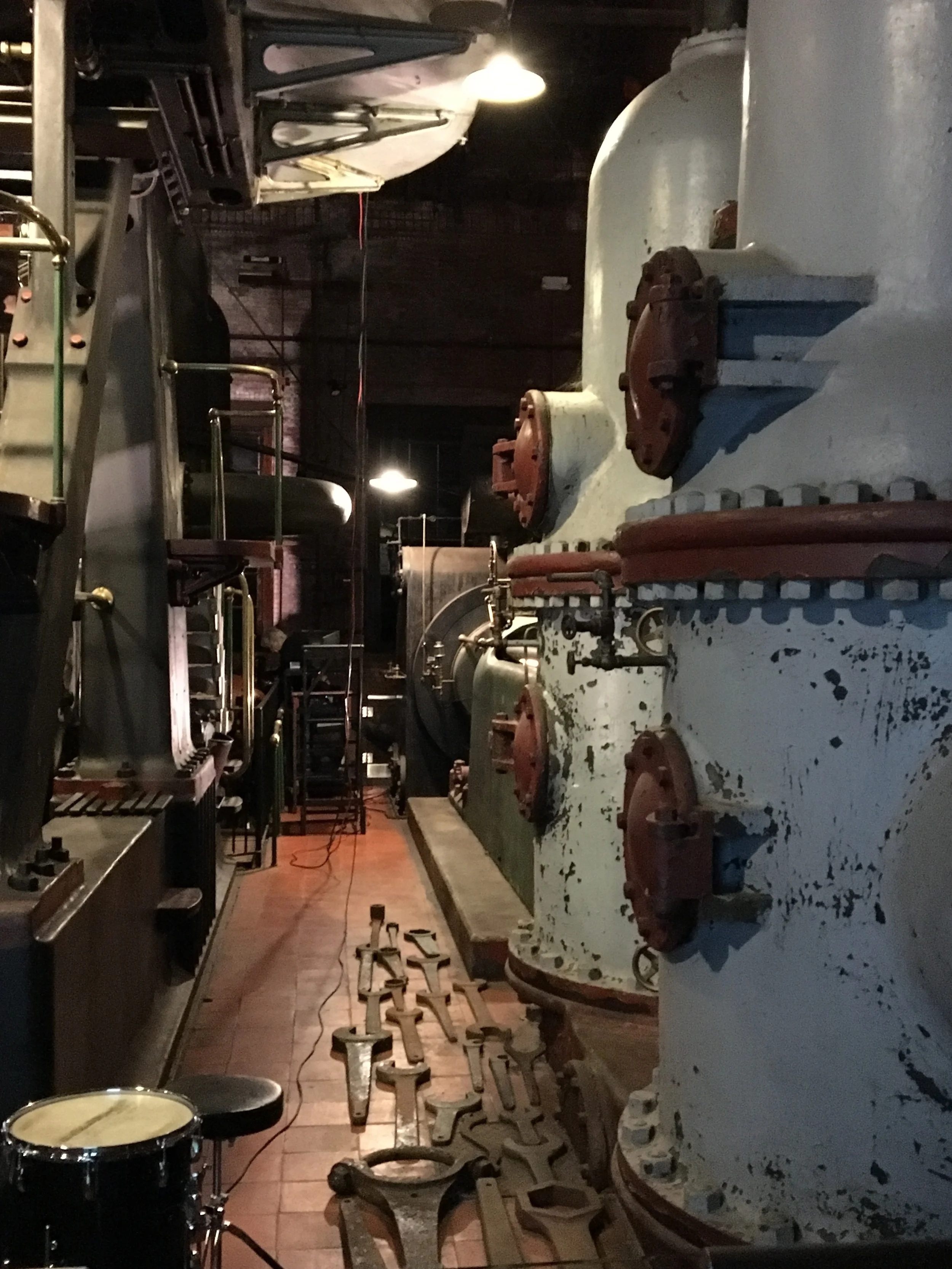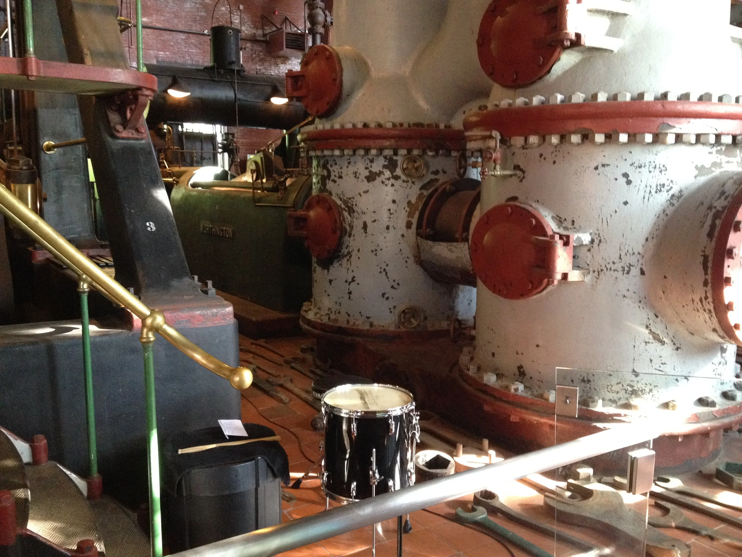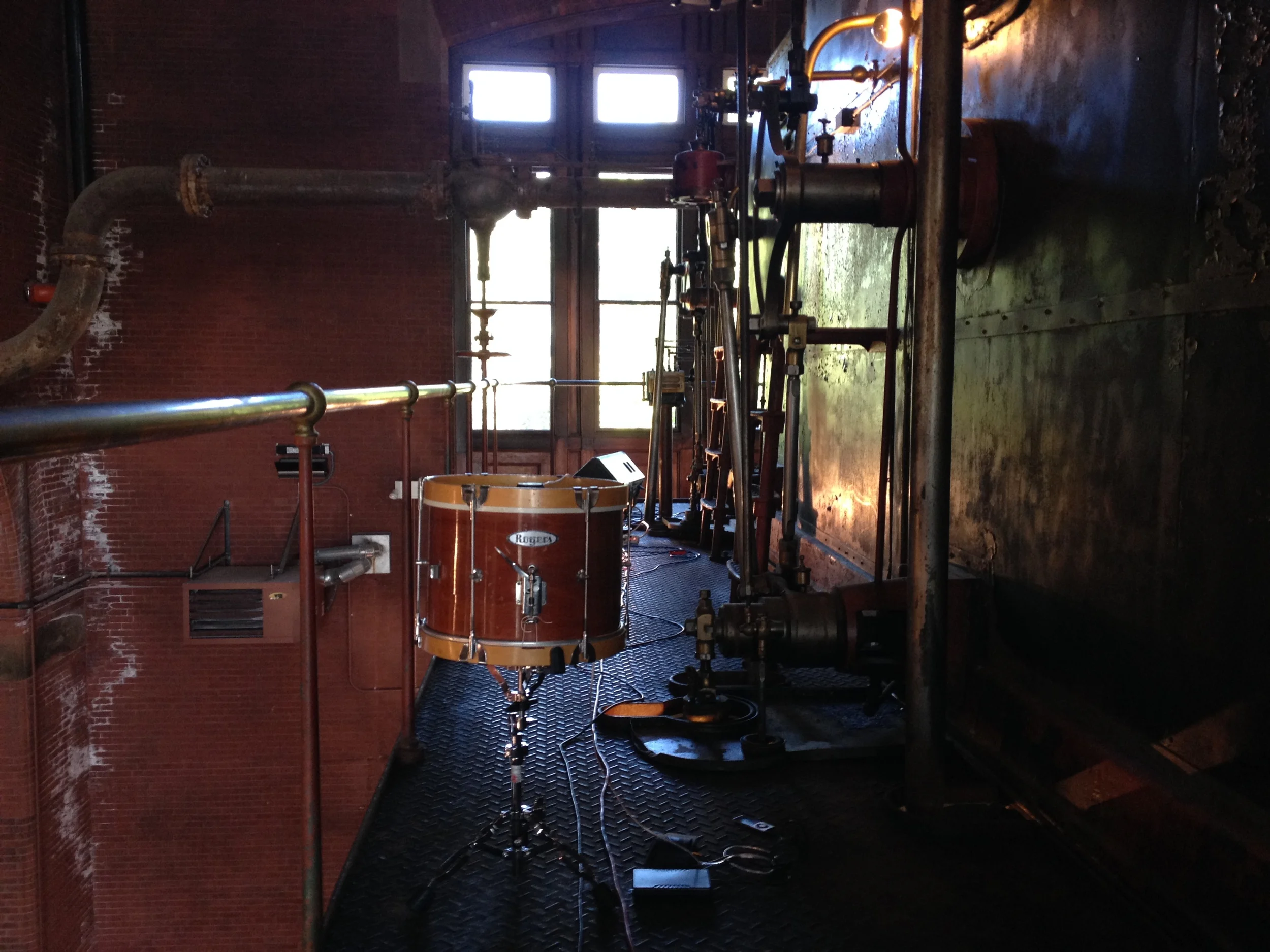 Each placed in different resonant environments throughout the site: the live drum at floor level between the Worthington-Snow and Leavitt-Reidler Engines; a second, at the base of the Leavitt-Reidler Engine, under a gantry one story below floor level; and two on opposite sides of the Allis Engine, at the other end of the hall, three and four stories above floor level.