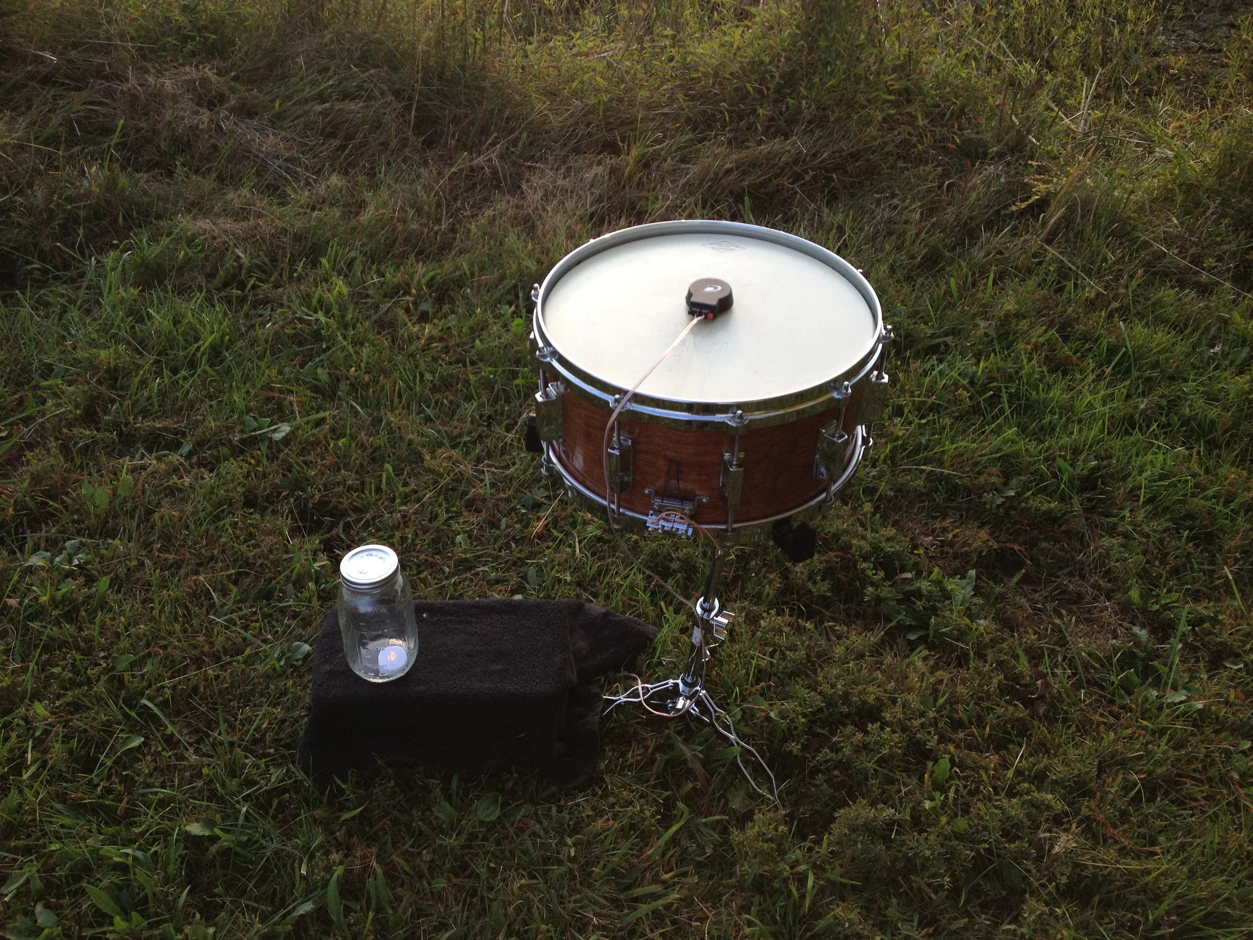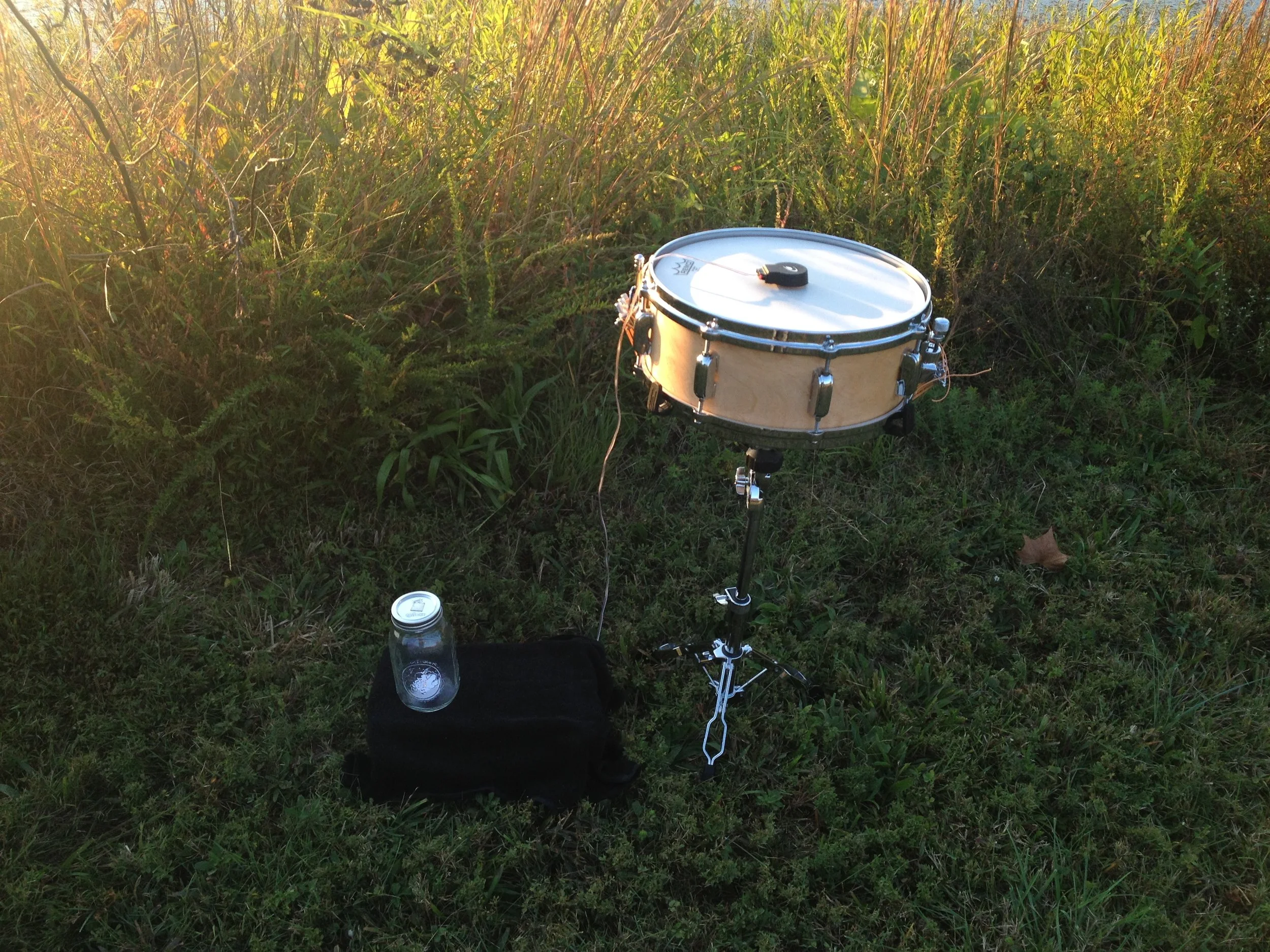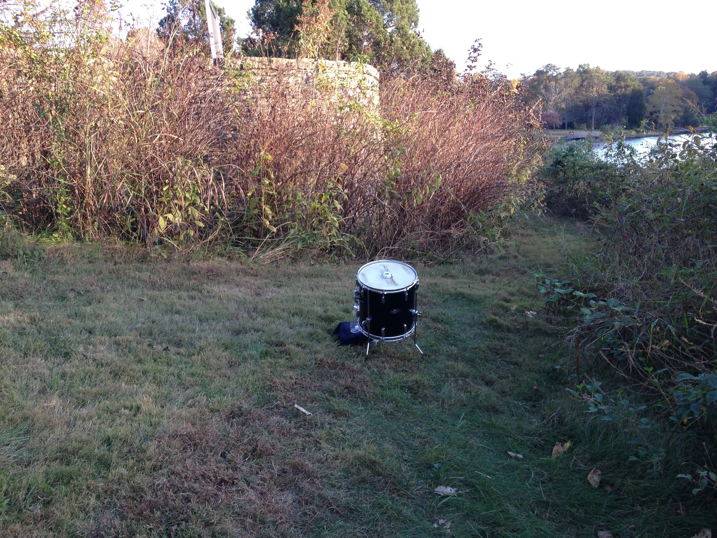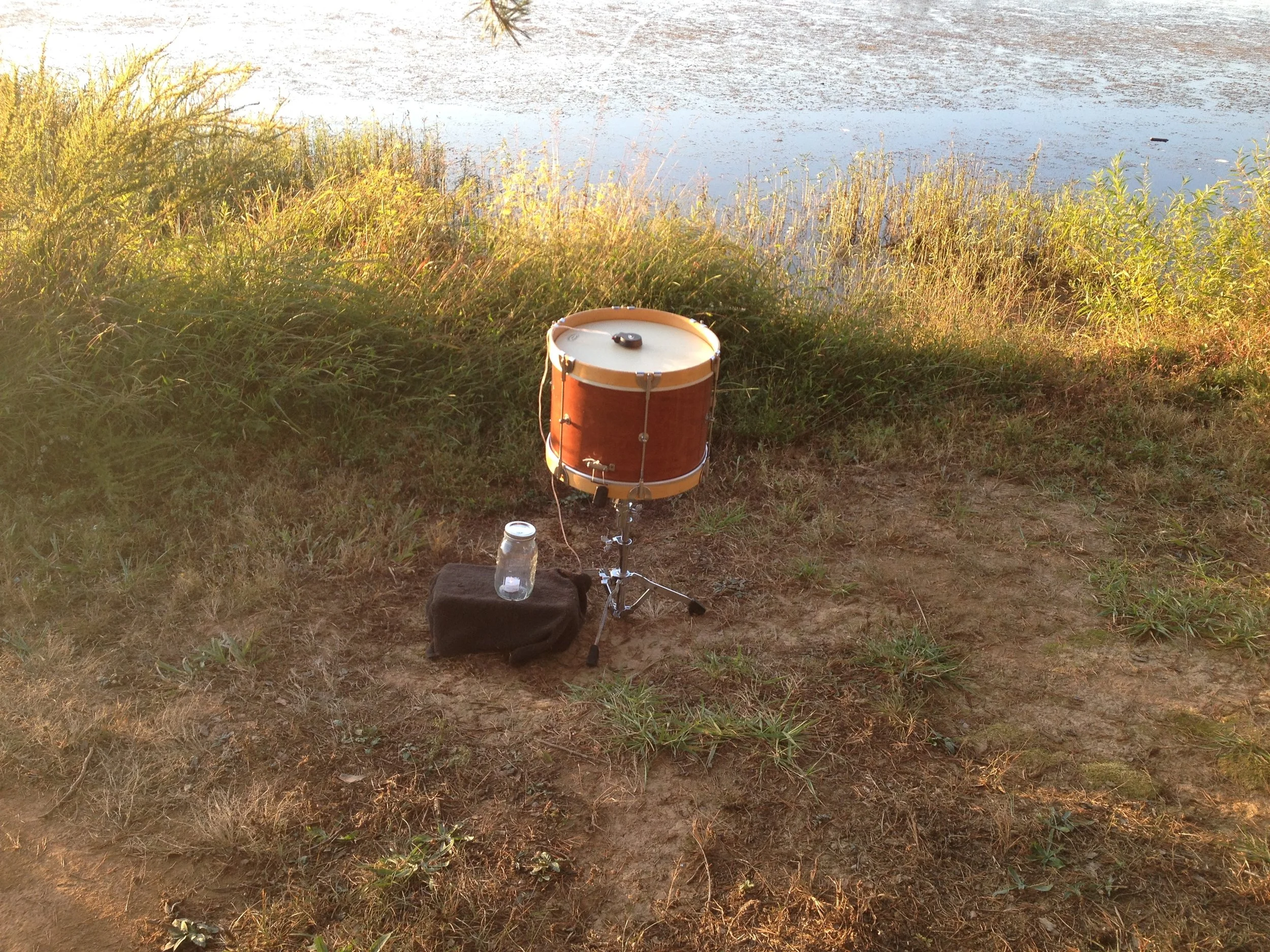 The staging points of the drums are linked by the consistency of their sound material, and when sounding together fade into an irregular droning texture, as different overtones collide, reinforce, and interfere with one another. At a distance, this texture fades into and blends with that of the natural soundscape generated by crickets, birds, and the nearby highway. At close range, the sound of an individual drum saturates its siting location.
