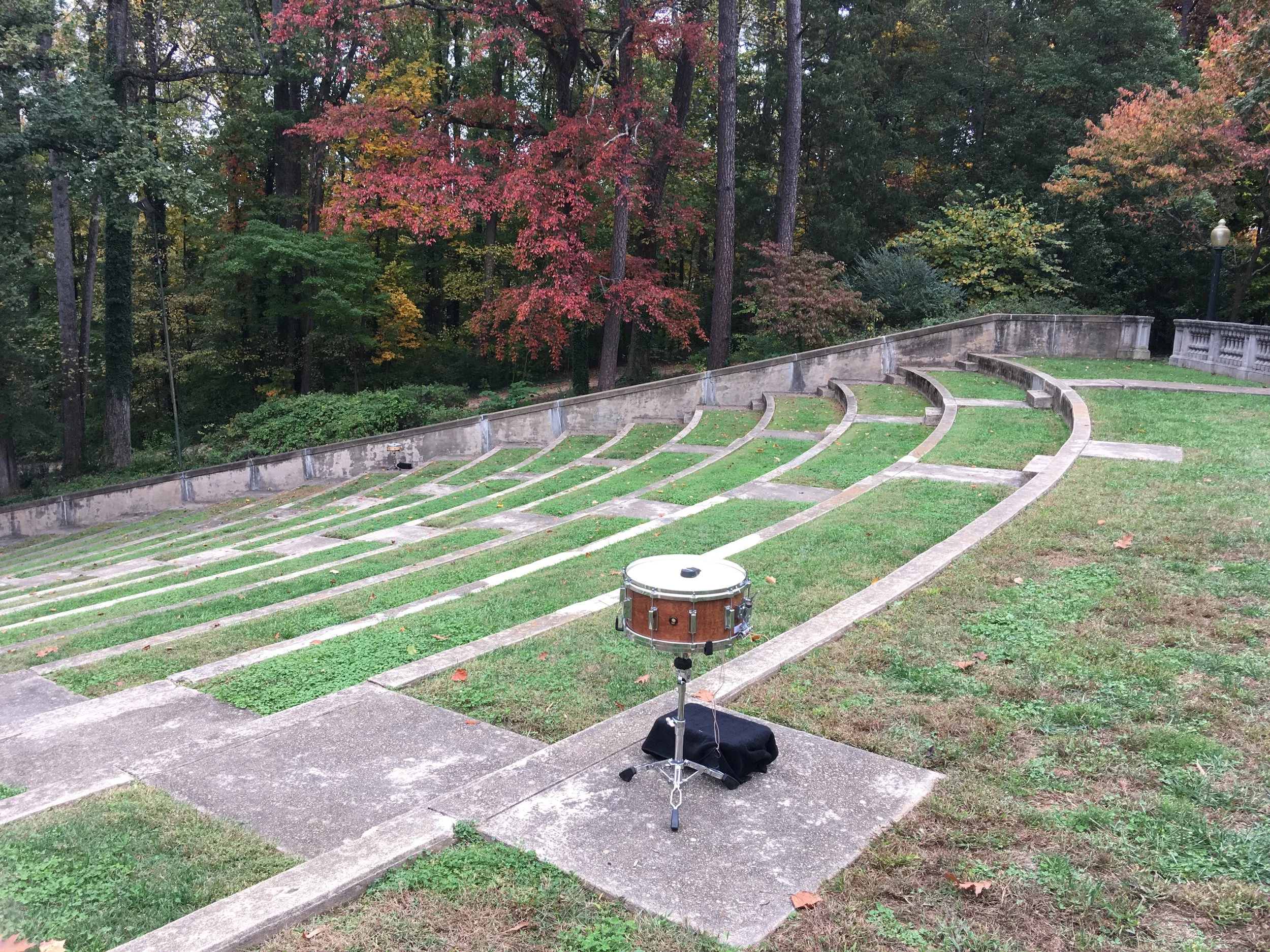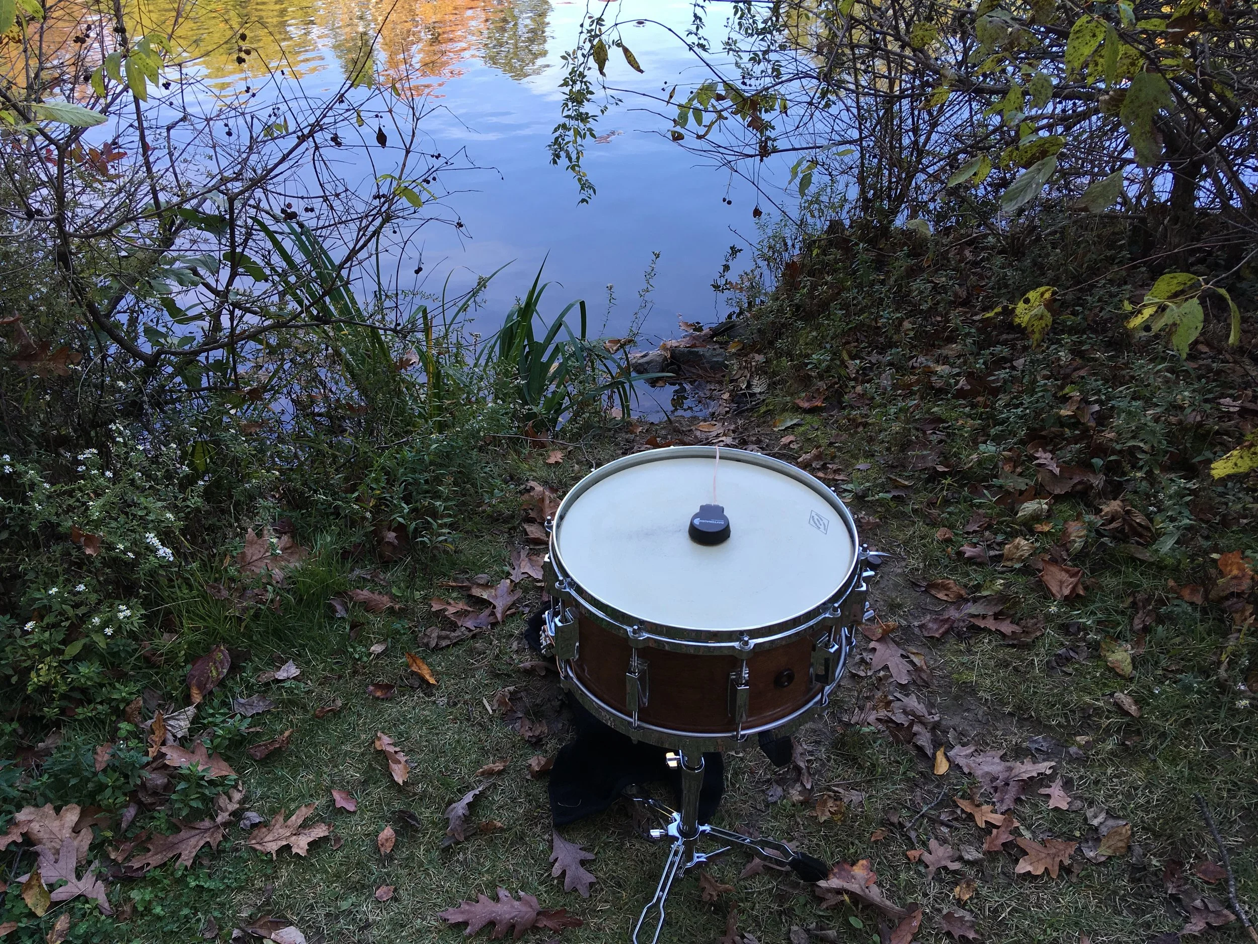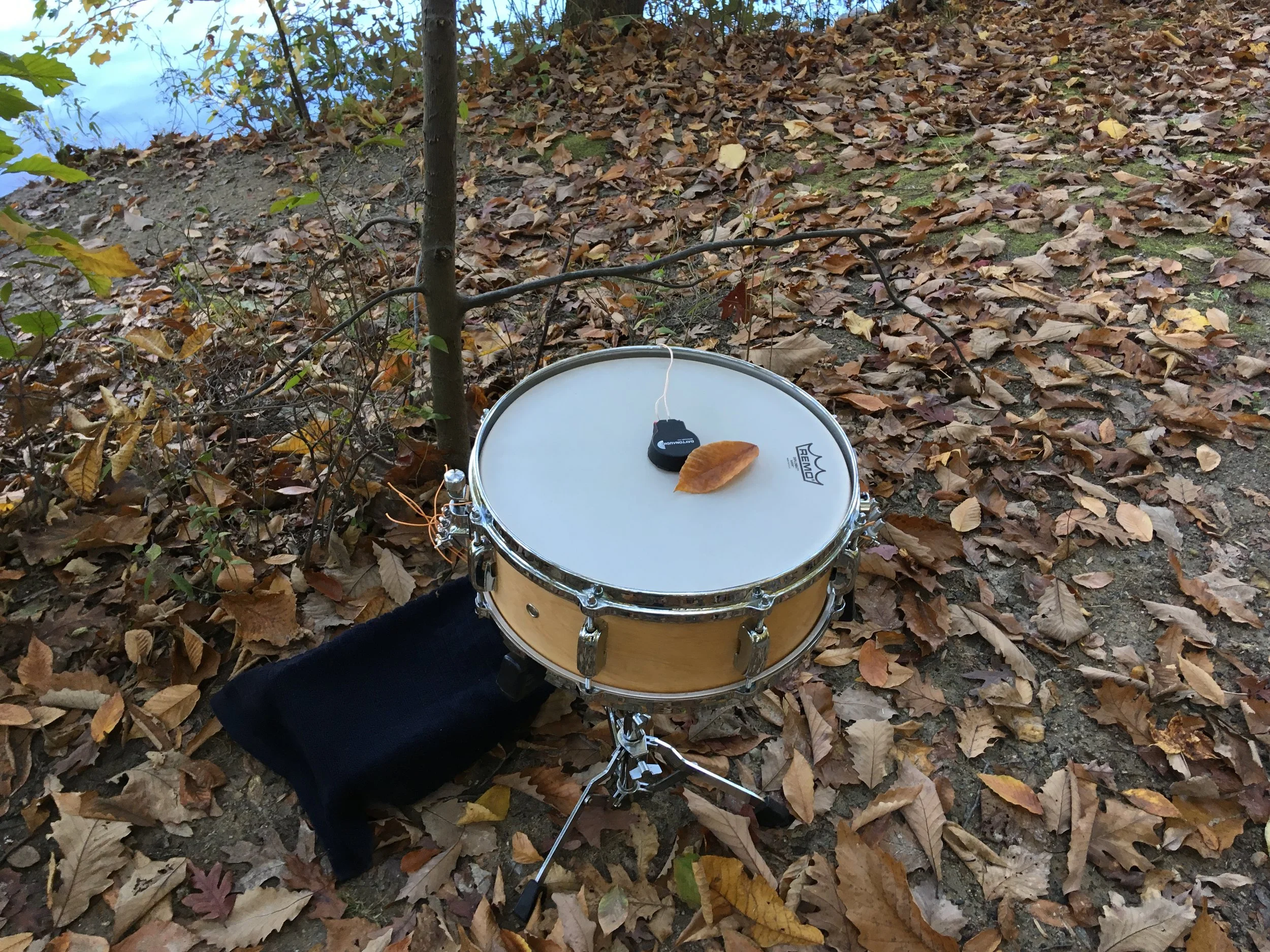 Four snare drums with transducers, each drum driven by a sound file cycling through recordings of partials derived from the bell in the Boatwright Library tower.